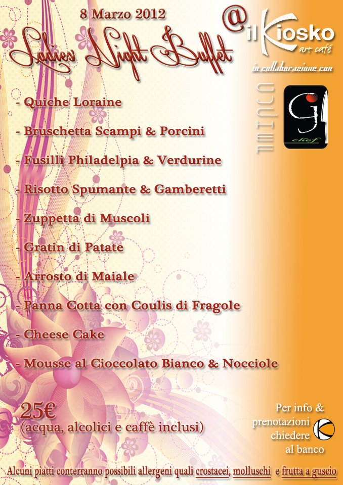 Questo Giovedì, per celebrare la Festa della Donna, verrà organizzato un ricco Buffet con piatti creati apposta per l'altra metà del cielo.